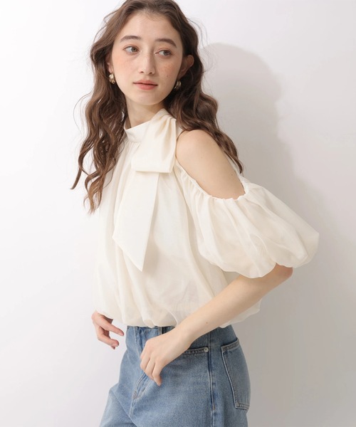 立体的リボンネックをあしらった華やかな印象のブラウス。ショルダーラインの絶妙な肌見せが女性らしさを際立てます。ボディラインを拾わない、ふっくらとしたバルーンシルエットは華奢見せに効果的。コンパクトな丈感でボリュームのあるボトムスでもバランス良く着こなせます。【ご注意】※撮影照明の関係により、実際の商品と色味が異なって見える場合がございます。また、パソコン・スマートフォンなどの環境により、製品と画像のカラーが異なる場合もございます。予めご了承ください。※商品画像はサンプルのため、色味やサイズ等の仕様に変更がある場合がございますので、予めご了承ください。