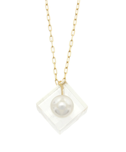 シンプルなアクリルパールを樹脂で包み込みました。定番のパールネックレスも、キューブ形の樹脂でコーティングすることで新鮮なイメージに♪胸元に程よくかかる長さはスタイリングを邪魔せず普段使いしやすいです。