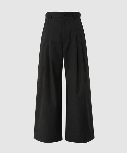 ワイドストレートな個性的なシルエットのパンツはフロントに深くデザインされた2タックが特徴。通常のタックよりも深く長めに設定されたタックはウエストから渡り部分にかけよりワイドで個性的なシルエットを生み出します。また生地にはウールとポリエステルをMIXさせたをエステルウールを使用。シワになりにくく耐久性がありながらもウールならではの上品な風合いが特徴。シャツやTシャツなどシンプルなコーディネートにおいてもパンツだけで十分個性的な合わせが出来る一本です。 These wide, straight pants feature a unique silhouette and feature two deep pleats on the front. The pleats are deeper and longer than normal pleats, creating a wider, more unique silhouette from the waist to the thighs. The fabric is made of ester wool, a blend of wool and polyester. It is wrinkle-resistant and durable, yet retains the elegant texture of wool. These pants can be paired with simple outfits like shirts and T-shirts to create a unique look.