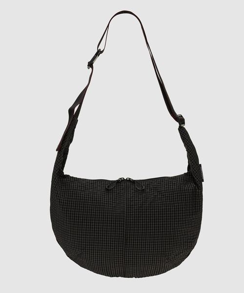 ボトムが丸くカーブしたデザインが特徴的なバッグは、体に沿う様に設計されたボディバッグタイプのデザイン。生地には「グリッドチェック」と呼ばれる細い格子柄によるチェックが使用されており主張しすぎないさりげない見た目が特徴です。左右どちらからも開閉できるスライダー付きのWジップ仕様となっており荷物の出し入れのし易いデザイン。また軽量な作りとなっておりメインバッグとしての使用はもちろん、物が増えた際のサブバッグとしてコンパクトにして持ち運べるサイズ感も魅力となったバッグです。 This bag features a rounded, curved bottom design and is a body bag designed to fit snugly against the body. The fabric uses a thin, checkered pattern known as "grid check," giving it a subtle look that doesn't stand out too much. The double zipper with a slider allows it to be opened from either side, making it easy to put things in and take them out. It is also lightweight, making it an attractive size that can be carried as a secondary bag when you have more luggage.
