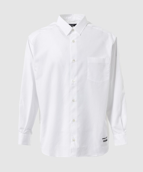定番として作り続けられている小さめの襟が特徴となるシャツは肌触りの良いコットンブロードを生地に使用した一枚。薄い生地ながらもしっかりと織られた上質なコットンブロードは洗いざらしでもさまになる素材感が特徴。シルエットには従来よりも身幅を大きくしたビックシルエットのパターンを採用しながらも全体的に大きくなり過ぎない様、着丈を調整する事でタックアウトで着た際のバランスがキレイに見えるのも特徴です。また裾にはブランドロゴ「COMME des GARCONS HOMME」を刺繍。シンプルなシャツにワンポイントのロゴがさりげないアクセントとなったデザインです。 This shirt features a small collar that has been made as a standard item and is made of cotton broadcloth that feels good against the skin. Although it is a thin fabric, the high-quality cotton broadcloth is tightly woven and has a texture that looks good even when washed. The silhouette has a big silhouette pattern with a wider body than usual, but the length has been adjusted so that it does not become too large overall, and it looks well-balanced when worn tucked out. The brand logo "COMME des GARCONS HOMME" is also embroidered on the hem. The design is a simple shirt with a subtle logo accent.