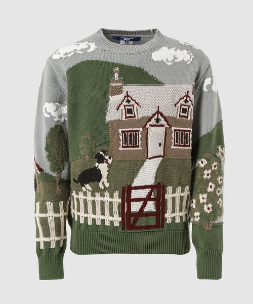 コットンをベースにウールをMIXさせたニットはフロントとバックにランドスケープ(風景)パターンのデザインを加えた一枚。ジャガード織りにより複雑に編み込まれたパターンは牧歌的なほのぼのとしながらもインパクトのあるデザインが魅力。ジャケットなどのインナーとしてはもちろん、一枚でデニムなどと組み合わせてもさまになるインパクトのあるニットには珍しい一着です。 This knitwear is made from a mix of cotton and wool, and features a landscape pattern on the front and back. The intricately woven jacquard pattern creates an idyllic, laid-back yet striking design. It's a rare piece of impactful knitwear that can be worn as an inner layer under a jacket or paired with denim on its own.