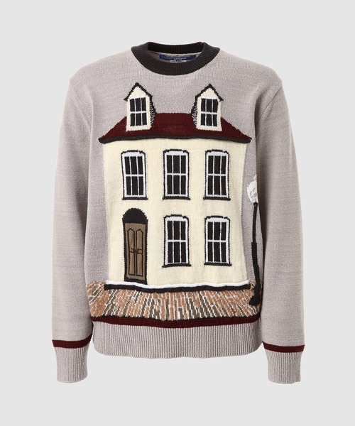 シルクをメインにウールを組み合わせたシルクウールを糸に使用したニットはなめらかな肌触りによる生地感が特徴。フロントにはインターシャ織りによる風景柄モチーフをプラス。インターシャ織りならではの厚みがなく細かく鮮明な織りによるデザインはシンプルでありながらもインパクトあるデザインに。ジャケットやブルゾンのインナーはもちろん、ニット一枚でもインパクトのある着こなしが楽しめる一着です。 This knitwear is made with silk wool yarn, a combination of silk and wool, and is characterized by its smooth texture. The front features a landscape motif made with intarsia weave. The thin, fine, and clear weave that is unique to intarsia weave creates a simple yet impactful design. It can be worn as an inner layer under a jacket or blouson, or even as a stand-alone knitwear piece for a striking look.