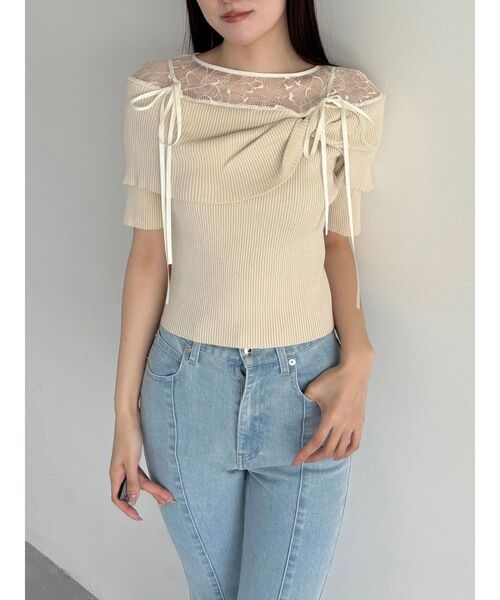 デコルテを美しく魅せるレース×リブ素材を組み合わせた、女性らしさ際立つトップス。 リブ編地で身体にほどよくフィットし、コンパクトなシルエットがスタイルアップを叶える一枚。 オフショル部分はねじりデザインで立体感を持たせ、ニットならではの柔らかなフィット感で女性らしいシルエットを引き立てます。 肩のリボンは肩山で結んでも、前後でアレンジしても華やかに決まり、シーンに合わせて表情を変えられるのも魅力。 ▼スタイリング マーメイドスカートやタイトスカートと合わせて、女性らしさを引き立てたコーディネートに デニムパンツを合わせれば、甘さを抑えた大人カジュアルスタイルにも◎ 足元はローファーミュールやブーツで、よりきれいめな印象にまとめるのがおすすめ~~ZOZOTOWNでお買い物を楽しむ便利機能~~♡商品のお気に入り登録完売カラーの再入荷時、ラスト1点の時、セール開始時に通知でお知らせします。予約アイテムが入荷して通常販売になった時もお知らせしてくれます!♡ブランドのお気に入り登録新商品や再入荷、セールやクーポン情報など、ブランドのお得な情報をいち早く受け取ることができます!※実際にお届けする商品と仕様やサイズが異なる場合がございます。また、生産の都合上、お届け時期が前後する場合がございます。※画像は全てサンプルです。※着用画像はフラッシュの加減で実際の製品と色味等が異なる場合がございますので、生地のズームアップ画像をご確認ください。※ご利用の端末画面の設定により実際の商品と色味が異なる場合がございます。【商品特徴】透け感:あり(レース部分のみ)伸縮性:あり生地の厚さ:普通サイズ感:細身裏地:なしポケット:なし