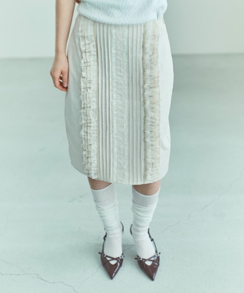 異素材フリルとレースが重なり、立体感を生むミディ丈スカート 【Material】 ドライな質感でハリのある素材をベースに、繊細なレースと異素材フリルを組み合わせたデザイン。異なる素材を重ねることで、奥行きのある立体感と上品な華やかさを演出します。甘くなりすぎず、大人のスタイリングに馴染む素材使いが魅力です。 【Design】 短すぎず長すぎないミディ丈で、トップスをイン・アウトどちらでもバランス良く着用できる設計。レースとフリルが縦に重なることで、自然と縦ラインが強調され、すっきりとした印象に。動くたびに表情が変わる、存在感のある一着です。 【Styling point】 同素材のブルゾンと合わせたセットアップスタイルで、異素材の重なりを活かした洗練された着こなしに。シンプルなトップスを合わせれば、フリルとレースの立体感が引き立ちます。スニーカーでカジュアルダウンしたり、パンプスでまとめたりと、足元次第で印象を変えて楽しめます。 ◇同素材で下記ご用意しております。 Lace Composition Blouson(品番:90034) --------------- 透け感:なし 裏地:なし 伸縮性:なし 光沢感:なし 生地厚さ:普通 ポケット:あり --------------- 【スタッフ着用コメント】 20代後半/身長:160cm/普通/普段サイズ:S/着用サイズ:1 サイズ感:ウエストはゆとりがあり、楽に穿けます。丈感は膝が隠れるくらいでバランスが取りやすいです。 着心地:締め付け感がなうので、長時間穿いてもストレスフリー。 0サイズでも窮屈感はなく問題なく着用できます。