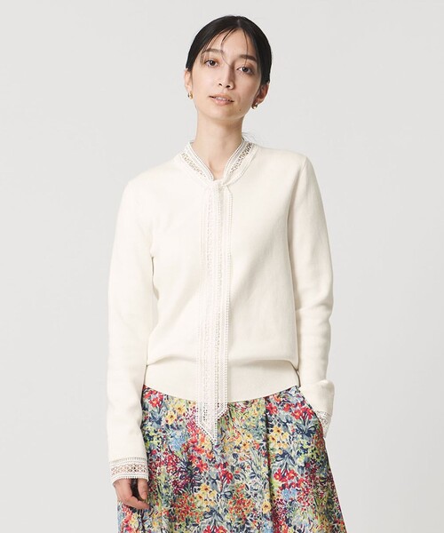 4WAYで楽しむ表情豊かなボウタイニット■デザイン襟と袖口に取り外し可能なケミカルレースをあしらったニット。襟と袖のパーツは、両方付ける・襟のみ・袖のみ・すべて外すの4通りの着こなしが楽しめます。ボウタイを外せば、すっきりとした小さめVネックになり、印象を自在にアレンジできるのも嬉しいポイント。OFF WHITE/LT.GRAYは白レース、BLACKは黒レースです。■素材ソフトな肌触りのコットンレーヨン混素材を使用したスムース編地。程よいふくらみ感と優しい肌触りが特長です。襟と袖口のパーツはケミカルレースを使用しています。■コーディネートコンパクトなシルエットなのでボリュームのあるスカートやワイドパンツはもちろん、テーパードやストレートパンツなどと合わせたすっきりシルエットもおすすめ。============================裏地:なし透け感:なし光沢感:なしケア方法:ドライクリーニング============================【注意事項】※商品に「取り扱い上の注意書き」、「洗濯表示」がございます場合は、使用前に必ずご確認ください。※商品画像は、光の当たり具合やパソコンなどの閲覧環境により、実際の色味と異なって見える場合がございます。あらかじめご了承ください。※商品の色味の目安は、商品単体の画像をご参照ください。店舗へお問い合わせの際は、全国のUNITED ARROWS各店舗まで下記の品名/品番をお申し付けください。品名:UBCMD LACE BOW 4WAY 品番:15131832790