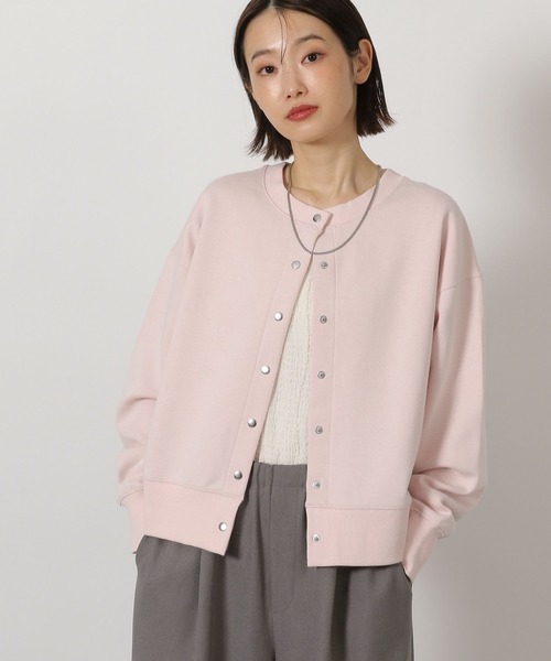スナップボタンデザインのカーディガン。カジュアル見えするスウェット素材でもスナップボタンでクリーンな印象になり、きれい目な雰囲気で着用いただけます。ドロップショルダーデザインは肩回りにゆとりもありストレスフリーな着心地の1枚です。【素材】Wフェイスのスウェット生地。滑らかな質感で肌触りの良さもポイントです。【スタイリング】ジャスト丈のカーディガンはスタイリングにも取り入れやすくオールシーズンで活躍する1枚。きれい目ボトムとの相性も〇