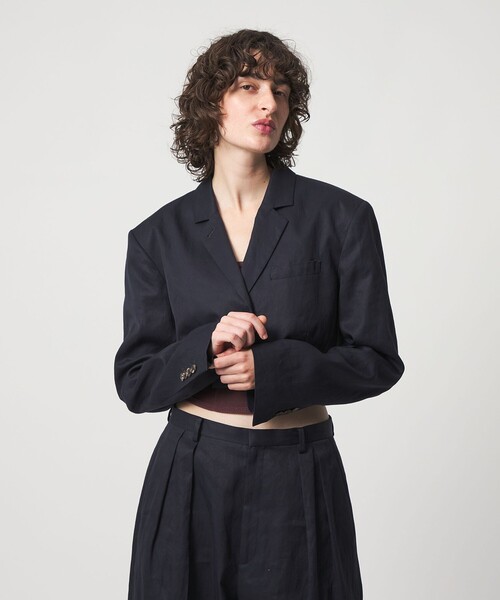 ハリと光沢のある生地を、しなやかな表情に加工したコットン生地で仕立てたジャケット。ショート丈やコットン素材で気負わない羽織りやすさがありながら、シックなネイビーカラーや上品な光沢感がエレガントな凛とした印象に導きます。ハイウエストやボリューミーなボトムスと合わせたメリハリのあるシルエットがバランスよく、ほどよいラフさをプラス。エリ部分にボタンホールがあり、あえて襟元を閉じた着方も可能。共地のパンツ(対象品番:86142000026))やショートパンツ(対象品番:86192000002)とセットアップスタイルもおすすめです。============================裏地:あり透け感:なし伸縮:なし光沢感:あり============================【注意事項】※商品に「取り扱い上の注意書き」、「洗濯表示」がございます場合は、使用前に必ずご確認ください。※商品画像は、光の当たり具合やパソコンなどの閲覧環境により、実際の色味と異なって見える場合がございます。あらかじめご了承ください。※商品の色味の目安は、商品単体の画像をご参照ください。店舗へお問い合わせの際は、全国の6(ROKU)各店舗まで下記の品名/品番をお申し付けください。品名:6 C SHORT JK ** 品番:86222000008