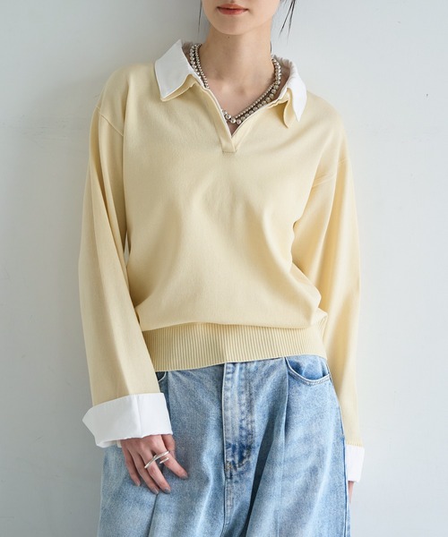 シャツをレイヤードしたようなデザインで、一枚でスタイリングが完成する主役級ニット■designスキッパー仕様の襟元にシャツ素材を組み合わせた、程よくきちんと感のあるドッキングプルオーバー。シャツ部分を長めに設定した袖は、折り返すことで表情の変化を楽しめます。裾はリブで切り替え、インせずともバランス良く着られる着丈に。Vラインを描く襟元が顔まわりをすっきりと見せ、抜け感のある大人カジュアルな印象に仕上げました。■materialさらりとした肌触りのニット素材と、シャツ生地をドッキング。シルエットをきれいに保ち、シワになりにくいのも嬉しいポイント。ロングシーズン活躍する、デイリーに取り入れやすい素材感です。透け感:なし伸縮性:ありポケット:なし裏地:なし■stylingデニムやワイドパンツと合わせて、程よく力の抜けた大人カジュアルスタイルに。スラックスやタイトスカートと合わせれば、オフィスシーンにも対応できるきれいめな着こなしが完成します。【ブランド情報】meilmada毎日が豊かになる洋服を。移り行く時代の中でトレンドを取り入れ、常に新しいスタイルを提案していきます。@meilmadaインスタオフィシャルアカウントにて新作更新中!【必ずご確認の上、ご検討ください】※商品画像・動画は撮影時の光や角度、お使いのモニター環境により実物の色味と異なって見える場合がございます。 商品の色味は、商品単品画像をご参照下さい。※サイト上のカラー・サイズ表記と商品タグのカラー名・サイズ名が異なる場合がございます。※着用、お取り扱いの際は商品についておりますアテンションタグ、洗濯ネームを必ずご確認ください。※生産時期により、色・素材・サイズ感など多少異なる場合がございます。※商品によっては、繊維や染料のにおいが感じられる場合がございます。数日のご使用や陰干しなどで匂いはほとんど感じられなくなりますのでお試しください。※通販の特性上、到着時には畳みシワがついている場合がございます。【Information】《お気に入り登録》がオススメ・「商品のお気に入り登録」で再入荷通知や、ラストの通知、セール通知も受け取ることが出来ます。・「ブランドのお気に入り登録」で新商品や再入荷など、お得な情報を受け取ることが出来ます。※ご注文いただいた予約商品のお届け時期の確認は、注文履歴ページより行えます。※他のキャンペーンにより、期間中に価格が変動する場合があります。※セールは予告なく終了させていただく場合もあります。