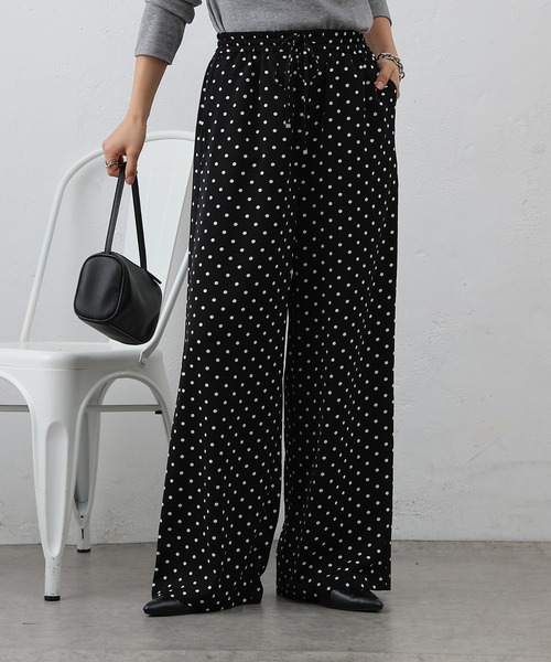 【合わせるだけでコーデが決まるドット柄イージーパンツ】バランスよく配置したポルカドット柄がポイントのイージーパンツです。シンプルなスタイリングに取り入れるだけで、程よく遊び心のある大人カジュアルな印象を演出します。素材には落ち感のある生地を使用し、動くたびに揺れる柔らかな素材となっています。ウエストは総ゴム+ドローコードのイージー仕様で、締め付け感が少なく長時間の着用でも快適な穿き心地です。シルエットは程よくゆとりを持たせつつ、すとんと落ちるラインで広がりすぎず、体型を自然にカバー◎Tシャツやブラウス、ニットと合わせたデイリーコーデはもちろん、ジャケットを羽織ったきれいめミックスもかわいく、シンプルなアイテムに合わせるだけでこなれた印象に。サイドに大きめなポケットも付いていて機能性も充実しています。オンオフ問わず活躍する着回し力の高い一本です。【商品ポイント】・合わせるだけでこなれた印象に・総ゴム+ドローコードのイージーパンツ仕様・程よいゆとりとストンと落ちるシルエットでスタイルカバーも◎----------------------------------------------------■商品特徴洗 濯 方 法 :洗濯機洗い可(弱)裏 地 :ベージュのみあり透 け 感 :なし伸 縮 性 :なし光 沢 感 :なし生地の厚さ:普通----------------------------------------------------■素材本体 : ポチエステル100%裏地(ベージュのみ): ポリエステル100%---------------------------------------------------- ※着用、お取り扱いの際は、商品についている品質表示とアテンションタグを必ずご確認下さい。※商品タグに記載されている商品名がWEBでの表記名と異なる場合があります。※実際の商品と仕様、加工、サイズが若干異なる場合がございます。※照明の関係により、実際よりもやや明るく見える場合がございます。またパソコンなどの環境により、若干製品と画像のカラーが異なる場合もございます。予めご了承くださいませ。【お気に入り登録】してお得な情報をCHECK!!・「商品のお気に入り登録」で再入荷通知や、ラストの通知、セール通知も受け取ることができます。・「ブランドのお気に入り登録」で新商品や再入荷など、お得な情報を受け取ることができます。