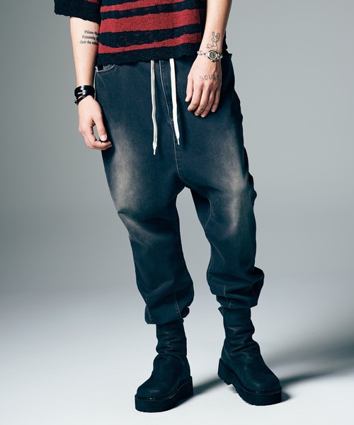 デニムとスウェットの個性を融合したニットデニムで優雅なシルエットを形作ったKnit Denim Pants。テキスタイルは複雑な織りを得意とするドビー織機で縦糸に硫化染めの色糸、横糸に白糸を用いて仕上げられたもの。スウェットのような柔らかさを持ちながら、加工によりデニムと同類の色落ちを見せる特殊素材となっております。ボディはglambの得意とする緩急あるサルエルシルエット。股上は膝にかかるほど深く設けながら、股下は裾の前後にダーツで縦のラインをシャープに絞ったテーパードが特徴です。ウエストはゴムとドローコードを組み合わせたイージー仕様。スポーティな裾のリブ仕立てもスタイリングの幅を広げます。