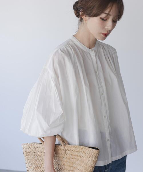 インド生産特有のエアリーな風合いが魅力のブラウス インド生産特有のエアリーな風合いで、肌への刺激も少ないコットン素材を使用したブラウス。 袖口はゴム仕様で捲りやすく、コットン素材で夏も涼しく着用できます。 生地をたっぷりと使ったボリュームのある袖がポイント。 POINT ・ご自宅で手洗い可能 ・脱ぎ着しやすい前開き仕様 COORDINATE シンプルなデザインで合わせるボトムスを選びません。ボタンを開けて羽織としてもお使いいただけます。 【2026 Spring/Summer】【26SS】 ※この商品はインドで素材調達、縫製を行っています。素材の特性上、多少の色差、織ムラ、フシなどがあります。インド製品独特の風合いをお楽しみください。 ※この商品は、縫い目などに過度な力が加わることで滑脱(縫い目が滑って開いたり、縫いしろが抜ける)する場合がありますのでご着用の際はご注意ください。 ※商品画像は、光の当たり具合やパソコンなどの閲覧環境により、実際の色味と異なって見える場合がございます。予めご了承ください。 ※商品の色味の目安は、商品単体の画像をご参照ください。 ▼お気に入り登録のおすすめ▼ お気に入り登録された商品は、マイページにて現在の価格情報や在庫状況の確認が可能です。 お買い物リストの管理にぜひご利用ください。 素材感 透け感 : あり 伸縮性 : なし 裏地 : なし 光沢 : なし ポケット : なし Free