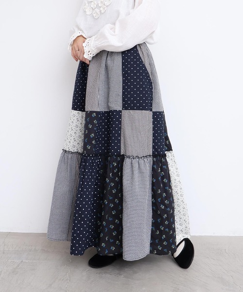 ひらひらと風を感じるようなたっぷりシルエットと、初夏の晴れた空や芝生が似合うかろやかな色合い。小花柄、ドット、ギンガムチェックを組み合わせたパッチワークは、さわやかだけど少しカントリーでノスタルジックな雰囲気。同系色でパッチワークした生地は、Tシャツなどのモチーフものとも相性がよいので夏まで長くきていただけます。ふわっと涼しげな切り替えの入ったギャザースカート。コーディネートの主役になってくれます。●サックスブルーチェック小:ポリエステル80% コットン20%チェック大:コットン55% ポリエステル45% ストライプ:コットン100%ドット柄:コットン100%花柄:コットン100%●ブラックチェック:ポリエステル80% コットン20%ストライプ:コットン100%ドット柄:コットン100%※着用商品はサンプルです。実際の商品と仕様、加工、サイズが若干異なる場合がございます。※光の関係で実物の商品の色味とは若干異なる場合がございます。実際に近い色味は詳細画像をご参照下さい。※取り扱いの注意については取り扱い表示をよくご確認の上、着用をお願いいたします。【素材の特性、お取り扱いの注意】・この製品は複数の生地をパッチワークしているため、大変デリケートです。強い力での縫い目の開き、引っ掛かりに気をつけて下さい。・この製品はデザイン上、無理な力を加えたり、乱暴に扱うと破損しやすくなっています。お取扱いにご注意下さい。・この製品は、配色使いになっておりますので、長時間水につけておいたり、濡れたまま放置しておりますと、淡色部分に汚染することがありますので、ご注意下さい。・この製品は、特に濃色の場合、汗や雨等でぬれた際や強くこすられた場合に色落ちし、他の衣料・小物に移染する事がありますので、ご注意下さい。・この製品は独特の風合いを出す為に製品洗いをしています。一枚一枚の色味、風合い、サイズ等も微妙に違いますが、他の製品では味わえない雰囲気をお楽しみ下さい。・この製品を洗濯する際には多少縮む場合がありますので、形を整えてから日陰で干して下さい。l'atelier du savon(アトリエドゥサボン) CONCEPT 1つ1つにかけられた手のぬくもり日々の生活に、少しのデザインを加えた大人の日常着あそび心とあたたかみ