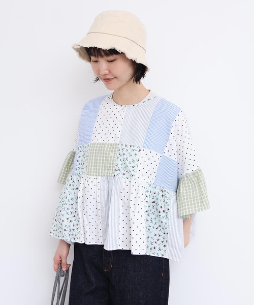 ひらひらと風を感じるようなたっぷりシルエットと、 初夏の晴れた空や芝生が似合うかろやかな色合い。 小花柄、ドット、ギンガムチェックを組み合わせたパッチワークは、 さわやかだけど少しカントリーでノスタルジックな雰囲気。 同系色でパッチワークした生地は、Tシャツなどの モチーフものとも相性がよいので夏まで長くきていただけます。 ふわっと涼しげな、シンプルに着るだけで決まるブラウス。 夏の羽織りとしてもおすすめです。 ●サックスブルー チェック小:ポリエステル80% コットン20% チェック大:コットン55% ポリエステル45% ストライプ:コットン100% ドット柄:コットン100% 花柄:コットン100% ●ブラック チェック:ポリエステル80% コットン20% ストライプ:コットン100% ドット柄:コットン100% ※着用商品はサンプルです。実際の商品と仕様、加工、サイズが若干異なる場合がございます。 サンプルからの変更点:身幅が5.5cm、裾幅が10cm小さくなり、ボリューム感が抑えられます。 ※光の関係で実物の商品の色味とは若干異なる場合がございます。 実際に近い色味は詳細画像をご参照下さい。 ※取り扱いの注意については取り扱い表示をよくご確認の上、着用をお願いいたします。 【素材の特性、お取り扱いの注意】 ・この製品は複数の生地をパッチワークしているため、大変デリケートです。強い力での縫い目の開き、引っ掛かりに気をつけて下さい。 ・この製品はデザイン上、無理な力を加えたり、乱暴に扱うと破損しやすくなっています。お取扱いにご注意下さい。 ・この製品は、配色使いになっておりますので、長時間水につけておいたり、濡れたまま放置しておりますと、淡色部分に汚染することがありますので、ご注意下さい。 ・この製品は、特に濃色の場合、汗や雨等でぬれた際や強くこすられた場合に色落ちし、他の衣料・小物に移染する事がありますので、ご注意下さい。 ・この製品は独特の風合いを出す為に製品洗いをしています。一枚一枚の色味、風合い、サイズ等も微妙に違いますが、他の製品では味わえない雰囲気をお楽しみ下さい。 ・この製品を洗濯する際には多少縮む場合がありますので、形を整えてから日陰で干して下さい。 l'atelier du savon(アトリエドゥサボン) CONCEPT 1つ1つにかけられた手のぬくもり 日々の生活に、少しのデザインを加えた大人の日常着 あそび心とあたたかみ