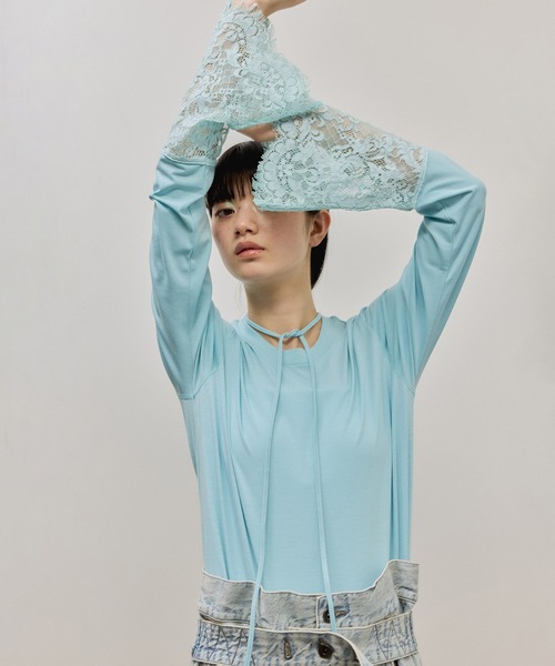 《イージーケア》存在感のあるレースカフスが華やかなアクセントをプラス。着脱できる紐リボンも嬉しい、チョーカースタイルなど幅広いコーディネートを楽しめるレースプルオーバー◇26SS◇ ADAM ET ROPE' FEMME 【Material】 身頃・袖:さりげない透け感のある天竺素材。伸縮性があり、気持ちの良い肌ざわりが特徴。 カフス:様々な間隔の目で構成されたメッシュ素材の上にコード糸を走らせ表現されたレース生地。 華やかな柄が特徴。 【Design】 レース生地で作製したカフスがポイントのロングスリーブTシャツ。 カーディガンやニットトップスのインナーに着用できるようボディはミニマルなサイジングに。 センターバックから共紐リボンを通し、首に巻いても、垂らしても素敵。 ちょっとしたアクセサリー代わりになるデザイン。 共紐リボンは取り外しが可能。 【Color】 コーディネートに困らないホワイト、あえてカラーのスタイリングの合わせにオススメなサックスの2色展開。 【Styling Point】 ジャケットやカーディガン、プルオーバーなどのインナーに着用するのがおすすめ。 カフスがポイントなので、少し袖口をまくったりニュアンスを出した着方を是非。 --------------- 透け感:ややあり 裏地:なし 伸縮性:身頃あり 光沢感:なし 生地の厚さ:薄手 開き方:かぶり --------------- ◇モデル情報 身長:165cm size:F ※撮影時の光、お使いのモニター環境によって色の見え方が違う場合がございます。