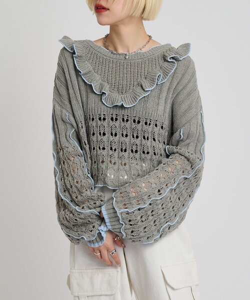 配色フリルが映える 透かし編みニットプルオーバー ▼デザイン ・透かし編みデザインが軽やかな春先にもピッタリなニットトップス ・襟元と袖に施した配色フリルが、シンプルながらもコーデの主役になる一枚♪ ・程よいショート丈でバランスが取りやすく、ワンピースやボリュームボトムとのレイヤードも◎ ▼コーディネート ・キャミワンピースに重ねて、透かし編みを活かしたレイヤードコーデに ・ショート丈を活かしたデニム合わせで、ラフだけど目を引くスタイリング ※洗濯、取り扱い 洗濯:40度限度 手洗い アイロン:低温120℃まで スチームなし(あて布使用) タンブル乾燥:不可 -------------------- 裏地:なし 透け感:あり 厚さ:やや厚め 伸縮性:ややあり -------------------- 【商品のお気に入り登録】 お気に入りアイテムの値下げ・再入荷・在庫1点などの通知を受け取ることができます。 【ブランドのお気に入り登録】 新商品や再入荷、セール、クーポン配布などお得な情報を受け取ることができます。 ※サイト上のカラー名と、お届け商品に記載されているカラー名が異なる場合がございます。 ※商品の色味は、撮影場所や光のあたり具合などにより色味が違って見える場合が御座います。また、お客様のお使いのPCのモニター環境などにより色味が違って見える場合が御座います。予めご了承の上ご注文下さい。 ※ご注文いただいた予約商品のお届け時期の確認は、注文履歴ページより行えます。