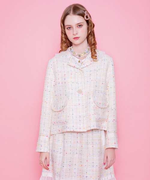 MILK 2026 Spring・Blooming イニシャル シリーズの世界観を、表情豊かなファンシーツイードで仕立てたジャケット。高級感のある質感が、コーディネートに奥行きと上品な華やかさをプラス♪・ツイード特有の重厚感を抑え、春の訪れを感じさせる明るくソフトなトーンが、お顔周りをパッと明るく見せてくれるのも嬉しいポイント◎・同素材の「 Blossom スカート(商品コード:101929145) 」とのセットアップスタイルがおすすめです!♡ Color ♡A,オフファンシー♡ Size ♡身幅 51㎝ / 着丈 56㎝♡ Material ♡レーヨン35% , ポリエステル20% , アクリル19%綿8% , ナイロン4% , キュプラ1% , その他13%