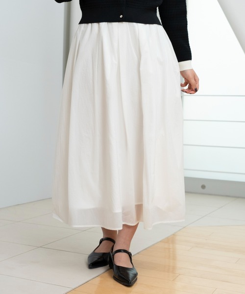 *シアータフタ 光を孕む透明感、歩くたびに踊るボリューム。シアーな風を纏う、大人のタフタスカート。重なり合う光と影が、日常を特別なシーンへと変えていく。 タフタ特有のハリ感はそのままに、旬のシアー感をプラスした「シアータフタ」のスカートが登場しました。 たっぷりと寄せたギャザーとタックが描く、計算された立体的なシルエット。 ドラマティックな分量感がありながら、驚くほど軽やかな佇まいは、まさに大人のための「主役級ボトムス」です。 洗濯:洗濯機使用可能(ネット使用) ■ Design & Fabric 使用しているのは、繊細な透け感と上品な光沢を併せ持つ「シアータフタ」。 薄手でありながらもしっかりとしたハリがあり、ふんわりとした美しいフォルムを一日中キープします。 ウエスト周りにはギャザーとタックを交互に配することで、腰回りのボリュームを抑えつつ、裾に向かって華やかに広がるシルエットを実現。 シアー素材から透ける裏地とのレイヤードが、足元にニュアンスのある奥行きと、軽快な抜け感を与えてくれます。 ■ Styling コンパクトなリブニットやカットソーをタックインして、スカートのボリュームを際立たせるメリハリのあるスタイリングがおすすめ。 あえてデニムジャケットや、オーバーサイズのシャツを羽織り、異素材のコントラストを楽しむのも今季らしい着こなしです。 足元は、華奢なサンダルで透明感を活かしたり、重めのブーツでバランスを取ったりと、合わせる靴次第で印象も自由自在。 デイリーなお出かけから、華やかなパーティーシーンまで。纏うだけで仕草まで優雅に見せてくれる、愛着の湧く一枚です。 《お気に入り登録》はお得がいっぱい! 「商品」のお気に入り登録で、再入荷、ラスト1点、セールなどお得な通知を受け取ることができます。 「ブランド」のお気に入り登録で、新商品や再入荷などいち早くブランドの情報を受け取ることができます。 是非、この機会にご登録くださいませ。