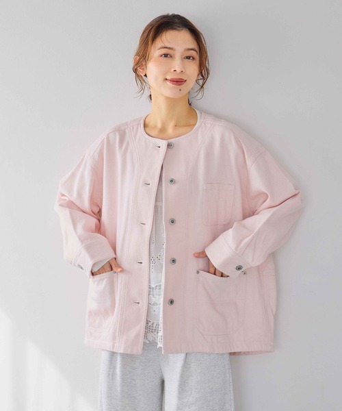 カジュアルながらも女性らしく着こなせるバックのボリューム感が可愛いノーカラージャケットーーー【素材】甘く織った柔らかな綿カルゼの素材を使用。カジュアル過ぎない素材感で、柔らかく優しい雰囲気です。【デザイン】ゆったりとしたサイズ感のノーカラージャケット。配色ステッチでカジュアルな印象ですが、ノーカラーデザインが女性らしく軽やかに着こなせます。後ろ側はバックボーンシルエットになっており、程よいボリューム感も可愛いポイント◎どんなボトムとも合わせやすく、カジュアルからフェミニンまで幅広く着回せる一着です。アウター ジャケット ノーカラージャケット ーーー【スタイリング】デニム合わせでカジュアルに、フレアスカート合わせでフェミニンに。ワンピースに合わせたスタイリングも素敵です。