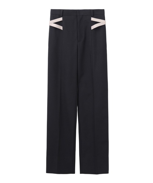ランジェリーのようなゴムストラップディテールを取り入れたフェティッシュなデザインのサイドストラップトラウザーズ。 すっきりとしたストレートシルエット。 高密度に緯糸を打ち込んだウールスーツ地で、さらっとした風合いが特徴。