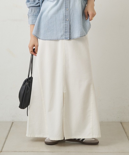 ピュアルセシン 2026 SS collection 【EFFORTLESS LUXE】◇Aラインでキレイ見せが叶うデニムスカート◇ ●商品のお気に入り登録クーポンやタイムセール、再入荷通知やラスト1点などお得な情報を受け取ることができます。ご登録をお忘れなく◎●デザインすっきりした台形シルエットと柔らかい履き心地が魅力のデニムロングスカート。10オンスのリヨセル混デニム生地は程よく厚みがありつつも、しなやかな生地感。サイドの切り替えによるフレアシルエットは腰回りやヒップ周りを美しく見せ、自然とスタイルアップを叶えてくれます。さらに、フロントスリットで足さばき抜群。ヴィンテージ感のある加工は程よい抜け感をプラスし、シンプルながらもこなれた印象に。カジュアルからきれい目まで、幅広いコーディネートに活躍する一枚です。●スタイリングカットソーやシャツをボトムスにインして、体形を美しく引き立ててくれるAラインスカートの特徴と合わせすっきりと見せることができます。スニーカーでカジュアルに、ブーツやフラットなパンプスを合わせてレディな装いなど、足元のアイテムで雰囲気を変えることもおすすめです。●素材10オンスのリヨセル混デニムでやわらかさが特徴です。===============================洗濯方法:ウエットクリーニング/手洗い透け感:なし裏地:なし伸縮性:なし光沢感:なし生地の厚さ:普通【スタッフコメント】年齢:20代前半/身長:153cm/普段着用サイズ:S~Mサイズ着用感:重すぎず程よい厚みで着用できました。くるぶしにかからないくらいの着丈でスニーカー合わせができました。スリットやサイドの切り替えにより、歩きやすかったです。===============================【デニム製品・色落ち色移りについて】この製品は、色落ち・色移りしますので着用の際は次の点に十分ご注意ください。●白・淡色系衣料品と重ね合わせ着用されますと、摩擦によって他の衣料品に色移りします。●白・ベージュ系のハンドバッグや靴等、アクセサリーも同様にご注意お願いいたします。●雨の日や汗等、濡れた状態はさらに他の衣料品等へ色落ち・色移りがしやすくなります。●こすられたり、もまれたりした場合、その部分の素材表面が毛羽立ったり、白っぽくなることがあります。●保管の際は、色移りを防ぐため、白・淡色系の衣料品と重ね合わせないでください。※着用、お取り扱いの際は、商品についている品質表示とアテンションタグを必ずご確認下さい。※撮影場所やお使いのモニター環境により若干お色味が異なる場合がございます。特にロケの撮影では明るく見える傾向にございます。 ※予約商品はサンプルで撮影をしております。若干の仕様が変更になる場合がございますので予めご了承の上ご注文くださいますようお願いいたします。【予約品の入荷時期について】店舗入荷時期と予約商品のお届け時期が異なる場合がございますので、予めご了承ください【予約品の入荷時期について】店舗入荷時期と予約商品のお届け時期が異なる場合がございますので、予めご了承ください