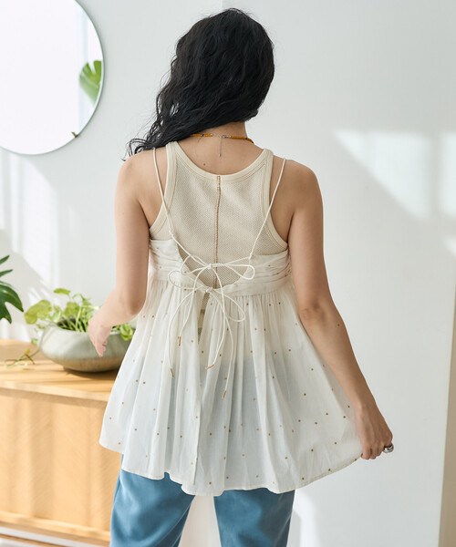 "MADE IN INDIA" インドならではの柔らかなコットン素材や技法を使用した繊細なデザインにこだわったシリーズです。 2026 Spring & Summer item ドット刺繍がさりげなく輝く、大人可愛いバックオープンキャミソール ●軽やかなコットン地にラメ糸でドット刺繍を施した、女性らしくも大人っぽいアイテム ●胸のギャザーと、胸下からのたっぷりギャザーがポイント ●胸切り替え位置を少し高めにすることでスタイルアップ効果も。気になるおなか周りもふんわりカバー〇 ●調整可能な肩ひもや後開きのリボンはインド製品らしい共布の丸い紐を使用。 紐先にゴールドとシルバーの糸を巻いたのもさりげないアクセントに ●フロントはもちろん、バックスタイルも抜かりなく可愛いアイテムです ●同生地のパンツとの[インド ラメドット刺繍パンツ/1142248903870]セット着用もおすすめです。 ■旧 1106248900649/1106248900662 と同型です。 おすすめコーディネート インナー次第で春先から真夏まで長く着回しの利くアイテム。 タンクトップやコンパクトなTシャツ合わせでヘルシーな着こなしや、古着っぽいプリントTシャツで合わせてカジュアルスタイリングも素敵です。 ボトムスはデニムやイージーパンツでラフに、足元はサンダルで抜け感を。 ※こちらの商品は、弊社管理上のカラーを表記しております為、タグのカラー表記と異なる記載となっております。 【サイト表記:タグ表記】 オフホワイト:OFF×GLD ブラック:BLK×SLV ブラウン:BRN×GLD ネイビー:NVY×SLV ※掲載画像の商品の色味は、屋外や屋内の光の照射や角度により実物と色味が異なる場合がございます。また表示のサイズ感と実物は若干異なる場合もございますので、予めご了承ください。 ※着用、お取り扱いの際は、商品についている品質表示とアテンションタグを必ずご確認下さい。 【FREAK'S STORE/フリークスストア】 「アメリカの豊かさとワクワク・ドキドキを日本に伝えたい」という想いからスタート。1986年の創業以来、洋服、雑貨、インテリアなど自分たちが本気でカッコ良いと思うものをセレクト。積極的に楽しむ生活体験者=フリークとして、アメリカンライフスタイルの楽しみ方を提案するセレクトショップです。