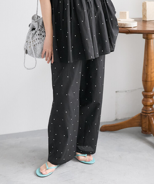 "MADE IN INDIA" インドならではの柔らかなコットン素材や技法を使用した繊細なデザインにこだわったシリーズです。 2026 Spring & Summer item リラックス感と上品さを両立した、夏の主役パンツ ●軽やかなコットン地にラメ糸のドット刺繍を施した、さりげない華やぎが魅力のパンツ ●インド製ならではの柔らかく空気を含んだ素材感で、暑い季節も快適な穿き心地 ●ウエストはゴム仕様で、リラクシーに着用できるデザイン ●体のラインを拾いにくいワイドシルエットで、抜け感のある大人スタイルに ●同生地のキャミソール[インド ラメドット刺繍 バックオープンキャミソール/1106248900672]とセット着用もおすすめです おすすめコーディネート シンプルなTシャツやタンクトップを合わせて、パンツを主役にした大人カジュアルスタイルに。 同素材のキャミソールとセットで着用すれば、統一感のあるリラックスコーデが完成します。 足元はサンダルやフラットシューズで軽さを出すのがおすすめです。 ※こちらの商品は、弊社管理上のカラーを表記しております為、タグのカラー表記と異なる記載となっております。 【サイト表記:タグ表記】 オフホワイト:OFF×GLD ブラック:BLK×SLV ブラウン:BRN×GLD ネイビー:NVY×SLV ※掲載画像の商品の色味は、屋外や屋内の光の照射や角度により実物と色味が異なる場合がございます。また表示のサイズ感と実物は若干異なる場合もございますので、予めご了承ください。 ※着用、お取り扱いの際は、商品についている品質表示とアテンションタグを必ずご確認下さい。 【FREAK'S STORE/フリークスストア】 「アメリカの豊かさとワクワク・ドキドキを日本に伝えたい」という想いからスタート。1986年の創業以来、洋服、雑貨、インテリアなど自分たちが本気でカッコ良いと思うものをセレクト。積極的に楽しむ生活体験者=フリークとして、アメリカンライフスタイルの楽しみ方を提案するセレクトショップです。