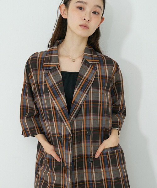 軽やかで涼しいオーバーシルエットジャケット コットン素材の夏まで使える羽織り -Design- チェック柄が目を引く、コットン100%の軽やかなハーフスリーブジャケット。 やや長めの着丈(69cm)とゆったりした身幅でリラックス感のあるオーバーサイズシルエットに仕上げました。 袖は肘が隠れるハーフスリーブで暑い時期まで快適に羽織れ、通気性の良い素材感が着心地を高めます。 フロントはダブルブレスト風のボタン仕様と大きめのパッチポケットがデザインアクセント。 同素材・同柄のパンツ(別売)と合わせれば統一感のあるセットアップスタイルに。 -Cordinate- ・同柄のワイドパンツとセットアップで、統一感のあるお出かけルックに。 ・タンクトップ+ジャケット羽織りで、ハーフスリーブの抜け感を活かした夏のレイヤードに。 ・細身のボトムを合わせればオフィスカジュアルにも。スニーカーやローファーで足元のテイストを変えて。 -クリーニング方法- 手洗い可 \同柄のパンツと合わせてセットアップ/ チェック タックパンツ [商品番号:38523850001] 【注意事項】 ※商品画像は、光の当たり具合やパソコンなどの閲覧環境により、実際の色味と異なって見える場合がございます。あらかじめご了承ください。 ※画像の商品はサンプルです。 ※商品の色味の目安は、商品単体の画像をご参照ください。 ※商品を使用前に、タグ等に記載されている「取り扱い上の注意書き」「洗濯表示」を必ずご確認ください。 ※商品に不良が無い場合、包装紙および箱の破損がございましても発送いたします。あらかじめご了承ください。 ============== ▼商品のお気に入り登録▼ ♡をタップorクリック!完売カラーの再入荷や、ラスト1点の通知、セールの際の通知を受ける事ができます。 ▼ブランドのお気に入り登録 ▼ 新商品や再入荷など、ブランドのお得な情報をいち早く受ける事が出来ます。 ==============