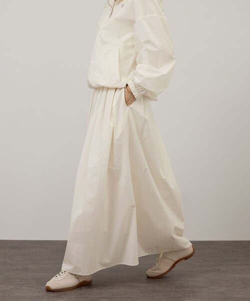 ■デザイン/シルエット ウエストALLゴムでリラクシーな着心地を叶えたマキシ丈スカート。 イレギュラータックを施すことで立体感が生まれ、シンプルながらも単調にならないデザインに仕上げました。 程よく広がるシルエットが気になる腰まわりをさりげなくカバー。 両サイドポケット付きで実用性も兼ね備えた、大人のデイリースタイルに活躍する一着です。 ■素材 細番手のコットン100%生機を高密度に織り上げ、シリコンコーティングを施した素材を使用。 しっとりとしたハリ感があり、美しいフォルムをキープします。 ナイロンのような軽やかなタッチながら天然繊維ならではのやさしい肌触りで、さらっと快適に着用できるのも魅力です。 ■コーディネート 同素材のブルゾンと合わせたセットアップスタイルがおすすめ。春らしい抜け感のある着こなしが叶います。 Tシャツやブラウスを合わせたきれいめカジュアルから、スニーカーで外した大人カジュアルまで、 単品でも着回しやすい万能スカートです。 ■コーティングシリーズ一覧 ・商品番号:SHC36140 商品名:コーティングフーディーブルゾン ・商品番号:SHL36140 商品名:コーティングギャザータックスカート ■モデル身長:166cm 着用サイズ:F ----------------------------- 裏地:オフホワイトのみあり 光沢感:ややあり 透け感:なし 伸縮性:なし 生地の厚さ:普通 -----------------------------