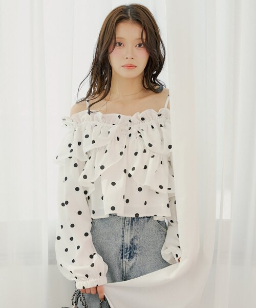 ドット柄が目を惹くオフショルフリルブラウス登場!▶商品ポイント・トレンド感のあるドット柄が、コーディネートのアクセントに。・オフショルダーとしても、ブラウスとしても着用できる2way仕様で、気分やシーンに合わせて着こなしを変えられます。・デコルテを華やかに飾るフリルが、女性らしさを引き立てます。▶スタイリングポイント・デニムパンツで合わせた王道モテコーデがおすすめです。・ミニボトムと合わせるとフェミニンなスタイルにも仕上がります。・今の時期はアウターを羽織って胸元のフリルをチラ見せさせるのも可愛いです!▶洗濯表示 ※取り扱い注意事項(詳しいお手入れ方法は商品タグをご参照ください……………………透け感:ややあり厚さ:薄手伸縮性:一部あり裏地:あり……………………--------------------------------------------▼お気に入り登録のおすすめ▼ハートをクリックしてお気に入りに登録すると完売カラーの再入荷や残り1点の通知、セールの通知を受けとることができます。▼ブランドのお気に入り登録▼新商品や再入荷、セール通知やショップのおすすめトピックスなど、いち早くブランドの情報を受け取ることができます。▼メルマガ登録▼Chicoのお得な情報やニュースを一足先にお届けします。--------------------------------------------※商品について・サイト上のカラー名と、お届け商品に記載されているカラー名が異なる場合がございます。・商品の色味は、撮影場所や光のあたり具合などにより色味が違って見える場合がございます 。また、お客様のお使いのPCのモニター環境などにより色味が違って見える場合がございます。予めご了承の上ご注文下さい。・セールは予告なく終了させていただく場合もございます。※商品ページでは、遅延などの影響も考え、お届け予定時期を少し先に設定させていただいております。予約商品は商品ページに記載しているお届け予定時期よりも早いお届け予定になる場合がございますので、予めご了承ください。※返品・キャンセルについて・着用、洗濯後の返品、交換は致しかねます。・商品到着後、着用前に商品を確認して頂きますようお願い致します。※画像の商品はサンプルです。実際の商品と仕様、加工、サイズ、素材が若干異なる場合がございます。※ご注文いただいた予約商品のお届け時期の確認は、注文履歴ページより行えます。