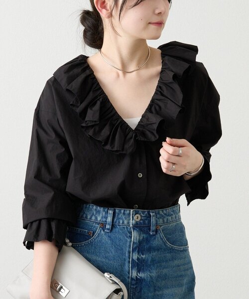 上品さと程よいカジュアル感を併せ持つ、ラッフルデザインのシャツ。 なめらかな風合いとハリ感のあるコットン素材を使用し、洗いをかけることで日常に取り入れやすい一枚に仕上げました。 ディテールに表情があり、着るだけでスタイリングが完成する主役アイテムです。 【デザイン】 衿元と袖口にラッフルをあしらった、女性らしさのあるデザイン。 衿のラッフルは立てても、開いても着用でき、着こなし次第で印象を変えられます。 甘さを抑えた分量感なので、デニムなどのカジュアルアイテムとも好相性。一枚でもレイヤードでも楽しめる、表情豊かなシャツです。 【ポイント】 ・なめらかで上質感のあるコットン100%素材 ・ハリがありつつ、洗い加工によるやわらかな着心地 ・袖口カフスのアジャストボタンで、ブラウジングしやすい仕様 ・キャミソールやタンクトップとのレイヤードが映えるデザイン 【コーディネート例】 襟元のラッフルが甘い印象なので、デニムなどのカジュアルアイテムと合わせたスタイリングがおすすめです。 特にデニムとの相性がよく、合わせるだけで簡単にコーディネートが決まるため、1枚持っているとおしゃれの幅が広がる便利なアイテム。 スニーカーを合わせればナチュラルで抜け感のある雰囲気に、ローヒールのパンプスや華奢なサンダルを合わせると、女性らしさをプラスした大人カジュアルスタイルが完成します。 サロペットやジャンスカのインナーとしてもラッフルが程よいアクセントになり、レイヤードスタイルも楽しめます。 【素材・洗濯表示】 素材:綿100% 洗濯表示:手洗い可 ※着用時・洗濯時は、必ず取扱い表示・タグをご確認の上、お取り扱い下さい。 ---------------------------------- 伸縮性:なし 光沢:なし 厚み:やや薄い 透け感:あり 裏地:なし ポケット:なし ---------------------------------- #CF-341