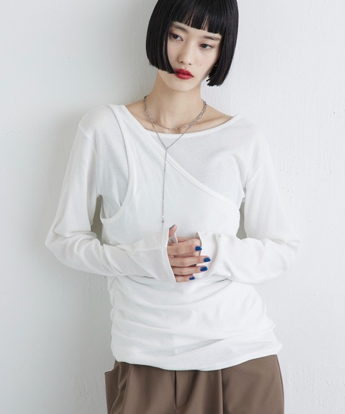 ワンショルダーレイヤードトップス 【ポイント】 ・タンクトップをレイヤードしたようなロングスリーブトップス。 ・控えめな透け感とタンクでヘルシーな印象のトップス。 ・ワンショルダーのタンクデザインがこなれ感も演出。 【素材】 《イージーケア》 天竺カットソー生地を使用したコットン100%。 肌触りが良く、通気性、吸水性に優れ、適度な伸縮性もあるので着心地抜群◎ シアー感が大人の雰囲気漂う、肌馴染みの良いレイヤードトップス。 【スタイリング】 ・スラックスやデニムにはもちろん、ジャケットや羽織りのインナーアイテムとしても。 レイヤードされた華奢なタンクがアクセントに。 ********************** 透け感:ややあり 裏地:なし 伸縮性:あり 光沢感:なし 生地の厚さ:普通 ********************** 【ブランド】 Lui's FEMME(ルイス ファム) 凛とした芯のある女性。 自立した、女性のワードローブをイメージ。洗練されたかっこよさの中に、女性らしさ・かわいさ・セクシーさを持つ。自分自身のスタイル(自分らしさ・個性・生き方・感覚...)を表現できるひとつの手段としての服。肩肘張らない、心地よいリラックス感のあるスタイルを上質な素材、優雅なシルエットで提案。 【注意事項】 ※画像の商品はサンプルです。実際の商品と色味、仕様、加工、サイズ、素材等が若干異なる場合がございます。 ※工場の生産の都合上、納期が変更になる場合がございます。発送日の前後については予めご了承ください。 ※入荷状況により、お客様への発送が店頭販売より遅れる場合もございます。 ※商品を使用前に、タグ等に記載されている「取り扱い上の注意書き」、「洗濯表示」を必ずご確認ください。 ※商品画像は、光の当たり具合やパソコンなどの閲覧環境により、実際の色味と異なって見える場合がございます。予めご了承ください。 ▼商品のお気に入り登録 完売カラーの再入荷通知やセール情報を受け取ることができます。 気になるアイテムは「お気に入り」登録がおすすめです! ハートマークをクリックし、お好きなカラーを選んでお気に入り登録をすると 残り1点のお知らせ、再入荷のお知らせ、SALE情報などを受け取ることができます。