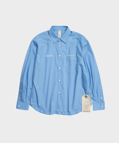 CONZ別注 CLASSIC SHIRT名前の通り、クラシックなシャツを目指したデザイン。ユニフォームをベースにしているブランドの味付けとして、第一ボタンのすぐ下に第二ボタンを施し、ボタンホールを斜めに空けるという、作業着のディテールを入れています。