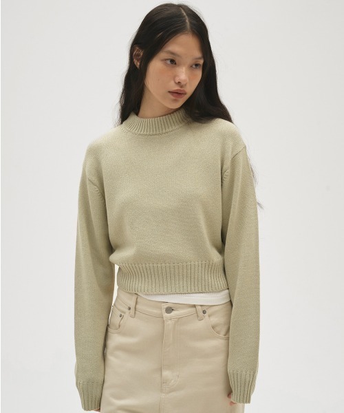 シャリ感のある糸を使用して編まれた春先におすすめのニットプルオーバー。肩線がなくヨーク切り替えのあるようなラインと、後ろ側だけが太い襟リブなど、細部にまでこだわりの詰まったミニマルなデザイン。コンパクトなサイズ感でボトムスのシルエットを選ばず、様々なスタイリングに馴染みます。