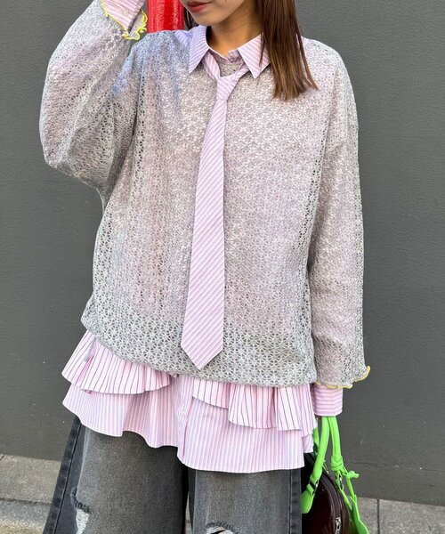 裾の絞りでシルエット自在な透かし編みニット ▼ポイント ざっくりとした透かし編みが今っぽい、ルーズシルエットのニットプルオーバー。 裾のドロストを絞ればシルエットに変化をつけられ、その日のボトムに合わせて丈感を調節できます。 袖口の配色メローがさりげないアクセントになり、手元まで抜かりなく可愛いデザイン。 広めのネックラインを活かして、ワンショルダーとしても着こなせる万能な一枚です。 ▼スタイリング そのままゆるっと着るのはもちろん、片方の肩を落としたワンショル風の着こなしでヘルシーな印象に。 裾を絞ってコンパクトにまとめれば、ボリュームのあるカーゴパンツやデニムとも相性抜群です。 --------------------------------------------------- 透け感:あり 伸縮性:あり 裏地:なし 光沢:なし --------------------------------------------------- 家庭洗濯:40℃限度/ 手洗い可 タンブル乾燥:不可 アイロン:低温110℃まで クリーニング:ドライクリーニング不可, 非常に弱い処理によるウェットクリーニング可 --------------------------------------------------- ※着用、お取り扱いの際は、商品についている品質表示とアテンションタグを必ずご確認下さい。 ※画像の商品はサンプルです。実際の商品と仕様、加工、サイズが若干異なる場合がございます。 ※可能な限り実物に近いカラーにて掲載していますが、撮影環境やモニター環境などにより製品と画像のカラーがやや異なって見える場合もございます。予めご了承ください。 【お買いものをよりお楽しみいただく為に!!】 ▼商品のお気に入り登録(ハートマークをクリック) お気に入りアイテムの完売カラーの再入荷通知や、ラスト1点の通知、セールの通知も受け取ることができます。 ▼ブランドのお気に入り登録 新商品や再入荷、クーポン配布などのお得な情報を受け取ることができます。