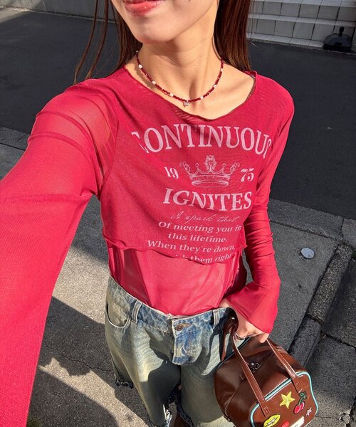 1枚でこなれるメッシュカットソー ▼ポイント 古着っぽいかすれロゴと、メッシュの透け感が絶妙なレイヤード風トップス。 裾が段差になったリメイクのようなデザインで、さらっと着るだけで奥行きのあるスタイルが完成します。 胸元は生地が重なっているため、透けすぎず安心して着られるのも嬉しいポイント。 袖口の配色メローがさりげないアクセントになり、シーズンレスに活躍する主役級アイテムです。 ▼スタイリング あえてゆるめのデニムを合わせて、トップスとのメリハリをつけるのが今っぽくておすすめ。 胸元のレイヤードを活かしつつ、袖口のメローをチラ見せさせることで、手元までこなれた印象に仕上がります。 --------------------------------------------------- 透け感:あり 伸縮性:あり 裏地:なし 光沢:なし --------------------------------------------------- 家庭洗濯:30℃限度/ 洗濯機[非常に弱い] タンブル乾燥:不可 アイロン:不可 クリーニング:ドライクリーニング不可, 非常に弱い操作によるウェットクリーニング可 --------------------------------------------------- ※着用、お取り扱いの際は、商品についている品質表示とアテンションタグを必ずご確認下さい。 ※画像の商品はサンプルです。実際の商品と仕様、加工、サイズが若干異なる場合がございます。 ※可能な限り実物に近いカラーにて掲載していますが、撮影環境やモニター環境などにより製品と画像のカラーがやや異なって見える場合もございます。予めご了承ください。 【お買いものをよりお楽しみいただく為に!!】 ▼商品のお気に入り登録(ハートマークをクリック) お気に入りアイテムの完売カラーの再入荷通知や、ラスト1点の通知、セールの通知も受け取ることができます。 ▼ブランドのお気に入り登録 新商品や再入荷、クーポン配布などのお得な情報を受け取ることができます。