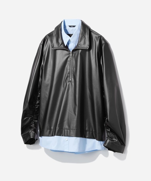 ーーー レザーの重厚感とシャツの清潔感を一枚に凝縮。軽やかに着こなす、技巧派ハーフジップレイヤードトップス。 ーーー DESIGN トレンドの「ハーフジップ×シャツ」のレイヤードスタイルを、これ一枚で完璧に再現できるドッキングトップス。 実際に重ね着しているように見えますが、実は見える部分だけを切り替えたフェイクレイヤード仕様。重ね着特有のごわつきや暑さを感じさせず、Tシャツ感覚でスマートに着用可能です。 ジップやボタンにはシルバーパーツを採用し、マットな質感の中でシャープな輝きを放ち、モードなアクセントとして全体を引き締めます。 MATERIAL 布帛生地に特殊な加工を施すことで、リアルなレザーの質感を表現したハイブリッド素材を使用。 一般的なフェイクレザーよりも圧倒的に軽く、通気性も確保されているため、レザー特有の蒸れや重さを感じることなく、シーズンレスで快適に楽しめる一着です。 ※サンプルにて撮影をしておりますので、実際の商品とは仕様や加工・サイズ等が若干異なる場合がございます。 ※屋外の光や照明の当たり具合で、実物と色味が異なって見える場合がございます。詳細画像の色味をご確認ください。 なお、商品の色や質感を出来るだけ忠実に再現するよう心掛けておりますが、パソコンなどの環境により、実物と若干異なる場合がございます。 ※写真を許可無くコピー・転用することは固くお断りします。