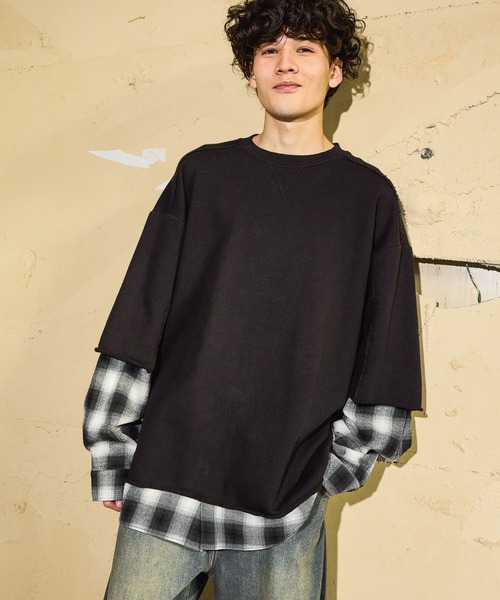 一枚で様になる古着ライクなビックシルエットプルオーバー【デザイン】まるでノーカラーシャツをインナーに重ね着したようなレイヤード風スウェット。袖、裾部分に布帛をドッキングし、限りなくレイヤードがリアルに見えるように仕立てました。スウェット部分はVガゼットや裾が切りっぱなしデザインになっており、古着ライクな雰囲気を楽しめます。重ね部分の幅感など、レイヤードが難しいと感じる方にも挑戦しやすいアイテムです。【素材】綿100%の柔らかくさらっとした肌触り。オンブレチェック部分は微起毛しており、ふんわりとした生地感です。【サイズ】かなりゆったりとしている、やや丈長なオーバーサイズシルエット。【コーディネート】カーゴパンツやデニム、スニーカーと合わせた古着ライクなカジュアルコーデ。ボトムスもワイドなものを合わせることで、ルーズに着こなすのがおすすめです。▽おすすめの合わせアイテム▽ 品名:エクストラワイドチノパンツ品番:636560※屋外の光や照明の当たり具合で、実際の商品の色味とカラー別画像の色味に違いが発生する場合がございます。商品の色味はスタジオ撮影の詳細画像にてご確認ください。※商品の色や質感を出来るだけ忠実に再現するよう心掛けていますが、実物と若干異なる場合がございます。※写真を許可無くコピー・転用することは固くお断りします。※取扱いアイテムは店舗により異なる場合がございます。