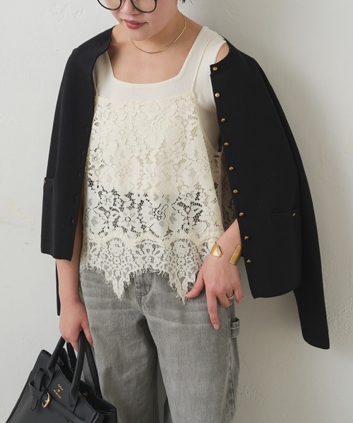 ピュアルセシン 2026 SS collection 【EFFORTLESS LUXE】◇いつものスタイリングを、フェミニンレースでブラッシュアップ◇ ●商品のお気に入り登録クーポンやタイムセール、再入荷通知やラスト1点などお得な情報を受け取ることができます。ご登録をお忘れなく◎●デザイン大小さまざまな花モチーフをランダムに配置し、豊かな表情を見せる総レースキャミソール。身頃と裾で異なるレースデザインを組み合わせ、ラグジュアリーな雰囲気が漂います。アーチの連なる裾は、フェミニンなレースアイテムにシャープさが加わり、甘いだけじゃないメリハリのついたスタイリングを楽しめる魅力ある1着に。控えめにフリンジを取り入れ、アンティークさが残るエッセンスをプラスし、キレイめからカジュアルなアイテムにも馴染みやすいこだわりを込めました。シルエットは、なだらかに広がるAライン。気になりやすいウエスト周りをカバーしながらも女性らしい柔らかな印象へ導きます。ほんのり透ける上品なレースでトレンドを押さえ、いつものコーディネートにさりげなく華やぎを添えるアイテムです。●スタイリングシンプルなニットやカットソーの上に重ねるだけでこなれたレイヤードスタイルが完成。Tシャツやシアーインナーに、ボトムはデニムを合わせればカジュアルなデイリーコーデに仕上がります。洗練された大人の装いには、テーラードジャケットやハリ感のあるシャツを羽織ると◎スウェットやニットの下にレイヤードする、トレンドの着こなしも裾レースで表情が加わりオススメです。●素材太めの糸でフラワー模様の刺繍を施した立体感が特徴のコードレース素材。軽やかで透け感のあるレース素材はさらりとした生地感で、春夏秋とロングシーズン着まわせます。===============================洗濯方法:透け感:あり裏地:なし伸縮性:なし光沢感:なし生地の厚さ:やや薄手【スタッフコメント】年齢:20代後半/身長:153cm/普段着用サイズ:S~Mサイズ着用感:肩紐で調整ができるので低身長でも、コーディネートに合わせて丈感を変えて着こなしを楽しめました。すっきりとした身幅のアイテムなので、インナーには薄手のトップス合わせがダボつかずきれいなフォルムで着用できそうです。===============================※着用、お取り扱いの際は、商品についている品質表示とアテンションタグを必ずご確認下さい。※撮影場所やお使いのモニター環境により若干お色味が異なる場合がございます。特にロケの撮影では明るく見える傾向にございます。 ※予約商品はサンプルで撮影をしております。若干の仕様が変更になる場合がございますので予めご了承の上ご注文くださいますようお願いいたします。【予約品の入荷時期について】店舗入荷時期と予約商品のお届け時期が異なる場合がございますので、予めご了承ください
