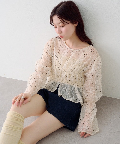 軽やかに透ける、大人チュールブラウス ■デザイン 繊細なドット柄にゆるやかなウェーブ刺繍を重ねたチュール素材が魅力のブラウス。 程よい透け感があり、女性らしい印象を演出。 前後2WAYでフロントはボタン仕様になっているので、前を開けて羽織として着用するのもおすすめです。 ■生地感 軽やかでさらりとした着心地。程よいハリ感があり、シルエットをきれいに保ってくれます。 シワになりにくく、デイリーからお出かけまで幅広く活躍。 *********************** 洗濯方法:手洗い可能 裏地:なし 透け感:あり 伸縮性:あり 光沢感:なし 生地の厚さ:薄め *********************** ■スタイリング 女性らしいデザインなので甘さを抑えたい方はデニム素材やスウェットパンツ合わせがおすすめ。 ミニボトムとのバランスは韓国トレンドの雰囲気に。 ▼おすすめスタイリングアイテム カットアウトスウェットパンツ フレアパネルデニム ポーチデニムロングスカート 【お取り扱いの注意】 ※着用時、洗濯時は必ず取り扱い表示・タグをご確認の上、お取り扱いください。 ※サイズ採寸は各モールによって異なり、多少の誤差が生じる可能性がありますのでご了承ください。 ※撮影画像はサンプル品を使用しているため、実際の商品とカラー、仕様、加工、サイズが若干異なる場合がございます。 使用しているパソコンのモニター設定や、携帯電話のメーカー・機種により実際のカラーと異なって見える場合がございます。予めご了承ください。 ▼商品のお気に入り登録 ハートマークをクリックし、お好きなカラーを選んでお気に入りに登録 完売カラーの再入荷通知や、ラスト1点の通知、セールの通知も受け取ることができます。 ▼ブランドのお気に入り登録 新商品や再入荷等、いち早くブランドのお得な情報を受け取ることができます。 <返品・キャンセルについて> ・着用・洗濯後の返品・ご交換は致しかねます。 ・商品到着後、着用前に商品を確認して頂きますようお願い致します。