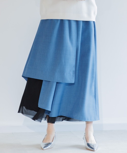 都会的なオーラを放つ主役級パンツ<POINT>フロントで大胆に重なり合う、エッジの効いた変形ラップデザイン。変形部分と裾からさりげなくシアー感が覗く設計で、どこから見ても隙のないお洒落に。ご自宅で手洗い洗濯が可能なイージーケア仕様。【デザイン・シルエット】アシンメトリーなカッティングから、繊細なシアーメッシュがドラマチックに覗き、歩くたびに視線を奪う複雑なニュアンスを演出。優雅に広がるワイドシルエットでありながら、絶妙な丈感に設定することで、低身長さんから高身長さんまでバランス良く履きこなせるような設計。ウエストはリラックス感溢れる総ゴム仕様で、お腹周りを優しく包み込みます。さらにポケット付きという実用性も備えているため、一度履いたら手放せなくなる快適な履き心地。【素材感】ワイドパンツに欠かせない「しなやかな揺れ」と、変形デザインを美しく保つ「適度なハリ」を両立。メッシュ素材のレイヤード部分はチクチク感のない滑らかな肌触りで、素肌が直接触れても心地よく、動きに合わせてしなやかに伸び縮みします。【カラー】ブラック アイボリー ブルー 3色展開【スタイリング】シンプルな薄手ニットに、あえてカッチリとしたジャケットを羽織れば、ひとくせあるお洒落なオフィススタイルに。ボトムと同色のシアータートルを合わせて奥行きを出せば、異素材の重なりが立体感を生む、洗練された大人のワントーンスタイルに。裏地:あり光沢:なし伸縮性:ややあり透け感:なし生地の厚さ:普通ポケット:あり※照明の都合上、多少の色ブレが生じてしまう可能性がございますので、予めご了承くださいますようお願い致します。※こちらの商品は畳まれた状態で納品されます。着用の前にスチームアイロンなどでアイロンがけをおすすめします。---------------------------------------------------●お気に入り登録でお得情報を手に入れよう!「商品のお気に入り登録」をすると、再入荷通知や、ラスト1点の通知、セールの通知など、お得情報が届きます。また、マイページでいつでも確認が可能になります。「ブランドのお気に入り登録」をすると、新商品や再入荷、などいち早くブランドの最新情報をお届けします。ぜひ、ご利用ください。----------------------------------------------------