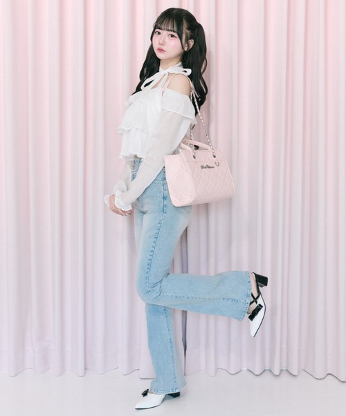バックロゴフレアーデニム品番:1161020020後ろ姿まで可愛い、ロゴ刺繍デニムパンツ。■デザイン・バックポケットのロゴ刺繍がコーデのアクセントに。・程よくフィットするストレートシルエットで脚をきれいに演出。・穿き込むほどに馴染むデニム素材で、デイリー使いに最適。・カラーごとに異なる雰囲気が楽しめる3色展開。■カラー・サックス/グレー/ブラックの3色展開■スタイリング・Glitter Logo Crop Tee (品番:1161060030)と合わせてバランスの良い着こなしに。・Ribbon Choker Frill Blouse(品番:1161040010)合わせで甘辛ミックスコーデも◎・足元は、Elegant Ribbon Mules(品番:1161130010)でコーデをまとめるのがおすすめ。--------------------裏地:なし光沢感:なし透け感:なし伸縮性:あり手洗い:不可タンブラー乾燥::不可アイロン:110℃以下--------------------model:165cm※着用、お取り扱いの際は、商品についている品質表示とアテンションタグを必ずご確認下さい。※ご覧のモニター環境や撮影環境により実際の商品と多少色味が異なって見える場合がございます。ご理解の程よろしくお願いいたします。
