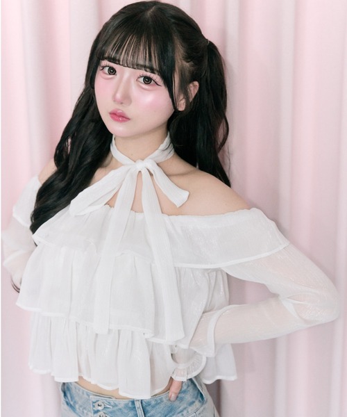 リボンチョーカーフリルブラウス 品番:1161040010ふんわり揺れるフリルで、デコルテから甘さを纏うシアーオフショル。■デザイン・オフショル仕様で、鎖骨や肩周りを華奢に見せてくれるデザイン。・シアー素材×段フリルで軽やかさとフェミニンさを両立。・首元のリボンが顔まわりのアクセントに。・程よい透け感で甘くなりすぎず大人可愛い印象に。・オフホワイト、ピンクは無地、ブラックはチェック柄です。■カラー・オフホワイト/ピンク/ブラックの3色展開■スタイリング・Back Logo Flare Denim (品番:1161020020)と合わせて甘さを引き算したカジュアルMIXコーデに。・Classical Short Pants(品番:1161020030)合わせもおすすめ。・ミニスカートでとことんガーリーにまとめても◎--------------------裏地:なし光沢感:なし透け感:あり伸縮性:あり手洗い:可タンブラー乾燥:不可アイロン:110℃以下--------------------model:165cm※着用、お取り扱いの際は、商品についている品質表示とアテンションタグを必ずご確認下さい。※ご覧のモニター環境や撮影環境により実際の商品と多少色味が異なって見える場合がございます。ご理解の程よろしくお願いいたします。■お気に入り登録のおすすめ【気になるアイテムを登録】ハートをクリックしてお気に入りに登録すると完売カラーの再入荷やラスト1点の通知、セールの通知を受けとることができます。【ブランドを登録】新商品や再入荷、セール通知など、いち早くブランドの情報を受けとることができます。