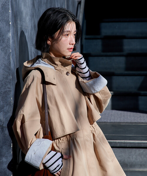 2026 Spring & Summer item 羽織るだけでこなれる、配色デザインのミドル丈アウター ●配色デザインがさりげなくトレンド感を演出するスプリングコート ●フードは取り外し可能で、スタンドカラーコートとしても着用可能です ●フードの内側や袖裏に配色を施し、袖を折り返したり着方次第で表情の変化を楽しめるデザイン ●ウエストにはドローコードを配し、ウエストを絞ってスタイルアップも叶います ●ハリのある素材を使用しているので、立体的なフードや雨除けのデザインなどバックシルエットも抜かりなくおしゃれを演出できます ●落ち着いたカラーリングを採用し、カジュアルからきれいめまで幅広いスタイリングにマッチ ●バランスの取りやすいミドル丈で、合わせやすく女性らしいシルエット ========== おすすめコーディネート デニムやワイドパンツにシンプルなトップスを合わせて、アウターを主役にした大人カジュアルスタイルに。 スカートやワンピースに羽織れば、女性らしさを引き立てたきれいめな着こなしもおすすめです。 フードを外してスタンドカラーで着用すると、すっきりとした印象になりオンオフ問わず活躍します。 ※こちらの商品は、弊社管理上のカラーを表記しております為、タグのカラー表記と異なる記載となっております。 【サイト表記:タグ表記】 オフホワイト:OFF×BEG ベージュ:BEG×BLUE ネイビー:NVY×OFF ※掲載画像の商品の色味は、屋外や屋内の光の照射や角度により実物と色味が異なる場合がございます。また表示のサイズ感と実物は若干異なる場合もございますので、予めご了承ください。 ※着用、お取り扱いの際は、商品についている品質表示とアテンションタグを必ずご確認下さい。 【FREAK'S STORE/フリークスストア】 「アメリカの豊かさとワクワク・ドキドキを日本に伝えたい」という想いからスタート。1986年の創業以来、洋服、雑貨、インテリアなど自分たちが本気でカッコ良いと思うものをセレクト。積極的に楽しむ生活体験者=フリークとして、アメリカンライフスタイルの楽しみ方を提案するセレクトショップです。
