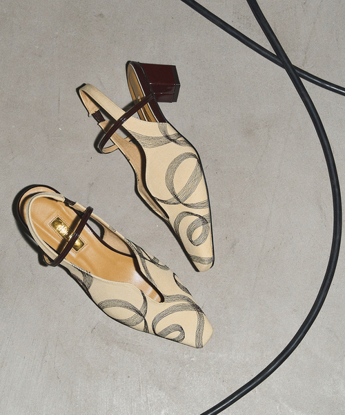 《WEB+一部店舗での取り扱い》人気のスリングバックパンプスに春らしい爽やかな新色が登場!オリジナルのリボンディテールをナチュラルなファブリックに刺繍しました。モノトーンカラーなのでスタイリングのポイントに使いやすい1足。ウェービーなカッティングが足を押さえつつ、甲のラインを美しく見せてくれるスリングバック。ストラップで甲と踵を前後でしっかり押さえてくれるので、ストラップが下がりにくく安定感のある履き心地です。デニムなどのカジュアルなアイテムからスラックスやロングスカートなどのきれいめなボトムまで、幅広いテイストに合わせやすいスリングバックです。**********************【スタッフ着用コメント】《スタッフT》普段サイズ:25/着用サイズ:25サイズ感: 素足で履いて丁度よい履き心地:普段のサイズでつま先なども当たる事が無く履くことが出来ます。ストラップでしっかりと足が押さえられるので、ヒールが苦手な方にもおすすめです。***********************品番:26191821144910に他カラーがございます。*柄の出かたには個体差がございますのでご了承ください。*サイズによりヒールの高さが多少前後することがございます。予めご了承ください。*照明の関係により、実際よりも色味が違って見える場合があります。またパソコン・スマートフォンなどの環境により、若干製品と画像のカラーが異なる場合もございます。*商品の色味は、商品アップ画像をご参照ください。
