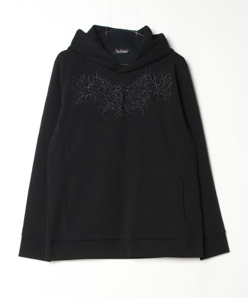 【DESIGN】今季のテーマ性を象徴する「トライバル柄」を、フロント胸元と背面に大胆かつ緻密な刺繍で表現したプルオーバーパーカーです。素材には、細やかな横リブが走るコットンポリウレタンの混紡ジャージーを採用。高比率でポリウレタンを配合することで、重厚な肉感と強靭なキックバック(伸縮性)を実現しました。特有の「ハリ感」がフードの立ち上がりや全体のフォルムを美しく構築し、カジュアルなアイテムをドレッシーな領域へと昇華させています。滑らかなタッチの高級感ある素材と、プリミティブで鋭利なトライバル刺繍のコントラスト。一枚でスタイリングの主役となる、今季のマストバイアイテムです。【TEXTILE】コットンとポリウレタンを混紡し、がっしりとした頼もしい肉感に仕上げたリブジャージー素材です。最大の特徴は、高比率で配合されたポリウレタンによる優れた伸縮性と、仕立て映えする独特の「ハリ」。表面には繊細な細横リブが走っており、滑らかなタッチと相まって、カジュアルなジャージー素材でありながらも洗練された高級感を醸し出します。体のラインを拾いすぎないしっかりとした厚みがあるため、一枚着としても安心して着用いただけます。