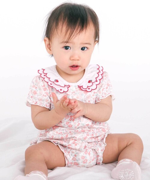 -26SS- 女の子ベビーの可愛らしさを引き立てる、半袖ロンパース。 ■デザイン 重ねたスカラップ襟がクラシカルな印象を演出し、上の襟端にはカラーごとに異なるモチーフをプラス。 レッド系にはいちご、ピンク系にはお花をあしらい、それぞれ異なる表情を楽しめます。 カラーごとに異なる花柄もポイントで、シンプルながらもこだわりを感じる仕上がりに。 裾口はメロウ処理で、動くたびにふんわりと揺れる可愛らしさをプラスしています。 1枚でコーデが完成するデザインで、忙しい毎日にうれしいロンパースです。 ■素材/機能 身生地にはやわらかなベア天竺素材を使用し、総柄プリントでぱっと華やかな印象に仕上げました。 フロントはホック仕様なので、お着替えやおむつ替えもスムーズなのがうれしいポイントです。 ▼お揃い 1809-81579:レギンス ※柄の出方は生地の裁断により一点一点異なります。 26春夏アイテム 【2026年2月のテーマ / Blooming Garden】 楽しいことも、おいしい時間も、一緒に分け合うよろこび。 やさしい気持ちになれるハート柄や愛らしい動物たちのモチーフに、あたたかなカラーを散りばめて。 大切な人と想いを共有できる、やさしく幸せなコレクション。 【2026 SPRING SUMMER / Wishing you joy-喜びが訪れますように-】 すてきな一日を願う気持ちをお洋服に込めて。 誰かを想うやさしさと、あたたかなぬくもりを感じながら、毎日が小さな幸せで満たされますように。 優しくてあたたかなイメージのコレクション。 【SLAP SLIP(スラップ スリップ)】 ~子どもの欲しいをカタチに~ ヨーロッパのこどものように 子どもらしい今しか着れないナチュラルなかわいさを提案 どこか上品で清楚感漂うフレンチカジュアルは いつものコーディネートをさりげなく格上げ