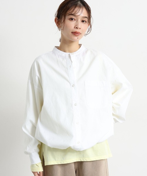 カジュアルから綺麗めまで幅広いスタイリングにこだわりの詰まったドロストシャツーーー【素材】コットン100%の細番手の糸で織り上げた、綺麗見えのオックス素材を使用。ベージュとサックスは配色ステッチになっており、軽やかな印象に仕上げています。【デザイン】程よくゆとりのあるリラックスした着心地の裾ドロストのシャツ。袖口はリブ仕様で袖を捲りやすく、袖口のふんわりとしたニュアンスも楽しめるデザイン◎襟のボタンを開けてやや抜き気味に着用することで、すっきりとした印象で着こなせます。カジュアルから綺麗めまで幅広いスタイルを楽しめるので、春のワードローブに追加したい一枚です。トップス シャツ ブラウス ドロスト カラーシャツーーー【スタイリング】ボトムスを選ばず、羽織としても楽しめる一枚。一枚ではもちろん、シアートップスやカットソーなどとのレイヤードもお楽しみいただけます。