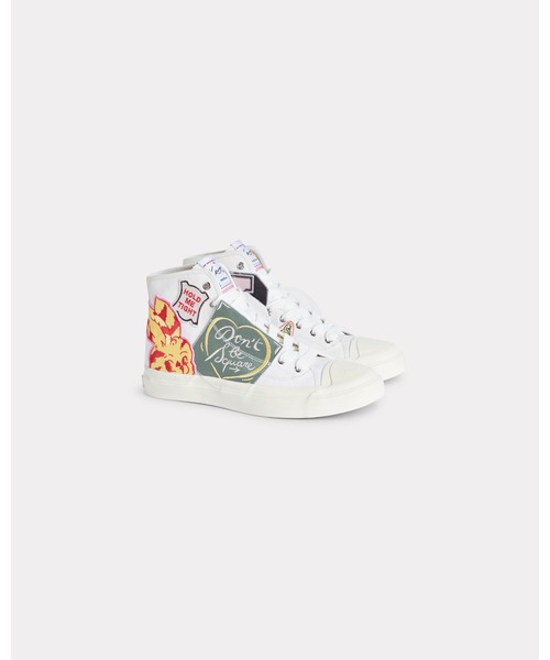 'KENZO Hoshi' ハイトップ スニーカー イン コットンキャンバス コットン ライニング 刺繍 パッチ 光沢のあるバルカナイズ ソール つま先に「KENZO」と「Paris」のデボス加工 ヒール後部にボックスロゴ 「KENZO Paris」のアウトソール KENZO archive シグネチャーとライン名が記されたタンの織りラベル