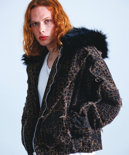 Revo. SELECT 最上の加工感を演出したテクニカルなアウター 斜めに入った切替の縫製処理をカットオフ仕様にすることでフリンジ感を演出し、ムラ染めのような独特の表面加工をスプレープリントで表現。さらにデニムにブラスト加工を施し、最上の加工感を演出したテクニカルなデニムフードブルゾン。ボリュームのある脱着式のフェイクファーや、胸にワンポイントで配置したブランドロコプレートなど、随所にデザインポイントがちりばめられた高級感あふれるアイテムです。短めに設定され絞の効いた着丈に広めの身幅で、ゆったり感がありながらもシャープなシルエットでトレンドをしっかりおさえたスタイルを完成させます。ブラック、インディゴブルー、レオパードの3色展開。スラックス、革靴などと合わせてアダルトな雰囲気に、カーゴパンツやダメージデニムパンツなどと合わせればトレンド感溢れるストリートコーデに仕上がります。 ・Y2Kを意識したショート丈のボックスシルエット ・ダボっとしたルーズ感がこなれた雰囲気を演出 ・被っても様になるボリューミーなフード ・細身のスキニーパンツやワイドパンツとも相性バッチリ ・女性の方でも着用して頂けるユニセックスデザイン ・トレンドのグランジ系ストリートスタイルにも◎ COORDINATE シャツやロンTと合わせてライトアウターとして、パーカーやニットを着込んでアウター感覚でも幅広いシーンで活躍します。デニムやチノパンを合わせたカジュアルスタイルから、パラシュートワイドパンツやトラックパンツと合わせたストリートスタイル、フレアパンツやスラックスなどと組み合わせた現代風なモードスタイルまで幅広く◎。また、寒さが厳しいシーズンは、中間着にカーディガンやGジャン、キルティングライナー等を着用すれば、防寒性も高まり旬なレイヤードスタイルをお楽しみ頂けます。足元はスニーカーは勿論の事、ローファー、アンクルブーツ、レザーシューズなどの革靴で上品な雰囲気の合わせも◎。また、スタイルのアクセントとして、スマホショルダーやボディバッグ、巾着バッグ、バケットハット、サングラスなどの小物使いもおすすめです。 STYLE カジュアル / 古着 / ストリート / グランジ / ロック / パンク / Y2K / 韓国ファッション / ジェンダーレス [UNDERGROUND/アンダーグラウンド] 「UNDERGROUND」をテーマにシンプルな中にもどこか無骨さとインパクトを感じられるアイテムを展開。シルエットはY2Kを意識しつつも加工や付属、縫製などでグランジ感を演出し独自のストリートスタイルを提案。 ================================= ≪お気に入り登録≫がおススメ! ▶商品のお気に入り登録(ハートマークをクリック) 完売カラーの再入荷通知や、在庫ラスト1点の通知、セールの通知を受け取ることができます。 ▶ブランドのお気に入り登録 新商品がUPされたり売り切れ商品が再入荷したときなど、いち早くブランドのお得な情報を受け取ることができます。 ================================= ※店頭及び屋外での撮影画像は、光の当たり具合で色味が違って見える場合があります。 ※商品の色味につきまして、お客様のお使いのPCのモニター環境により実際のカラーと画像の色味が違って見える場合が御座います。予めご了承の上、ご注文下さい。